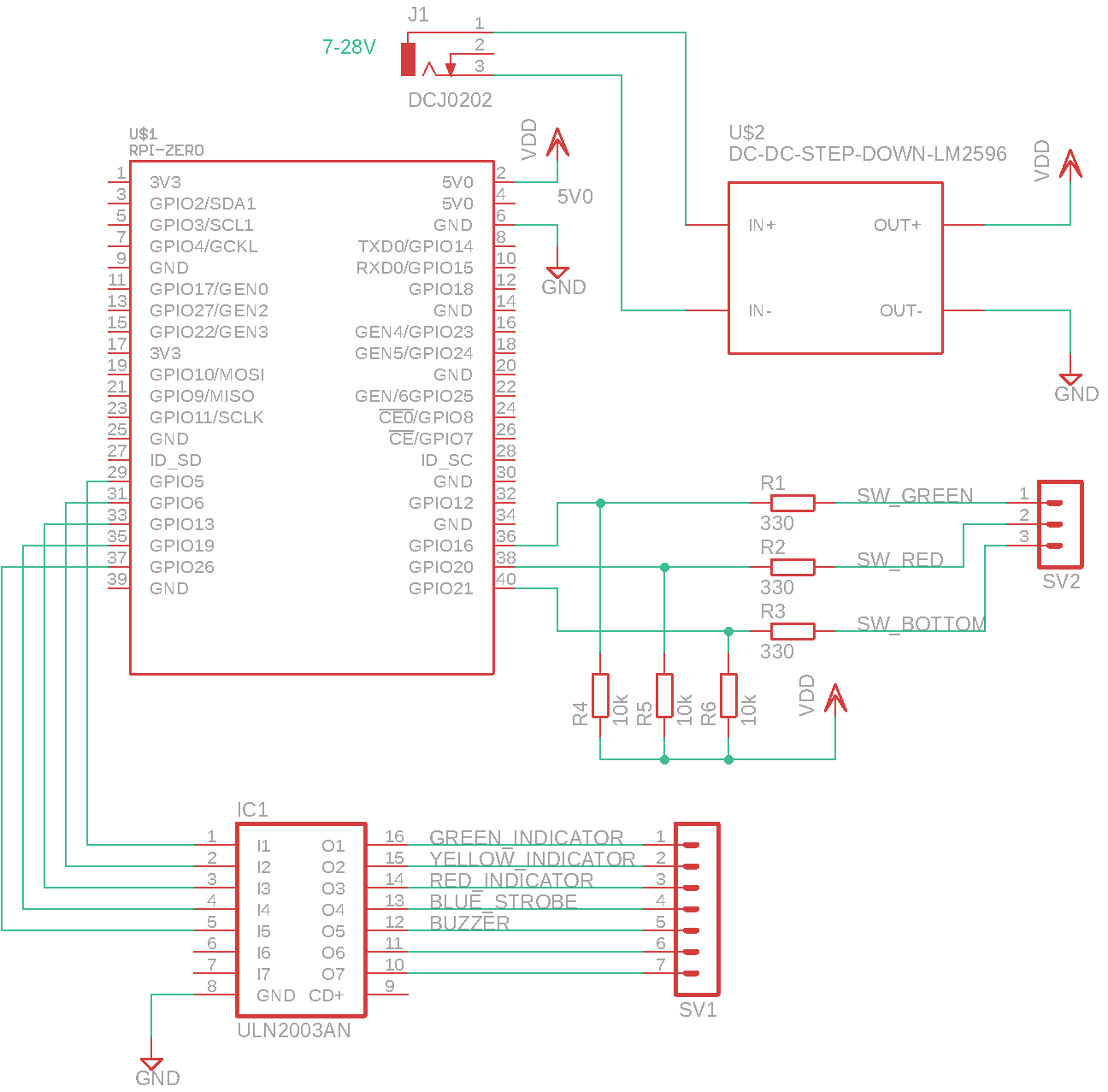 For the outputs, I’m using a Darlington driver, ULN2003A. It is pretty much perfect for this application; it is compact, has base resistors, and take 5V on the inputs. The Raspberry Pi doesn’t have 5V on its GPIO, it has 3.3V, but I found this works just as well with the ULN2003A.