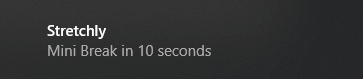 So I’ve decided to take more breaks. I have discovered an application called Stretchly. It pops up every 10 minutes with a few tips for a 10-30 second break. Every 30 minutes it reminds me to take a 5 minute break. These times can be adjusted, but I’m just going with the defaults for now.