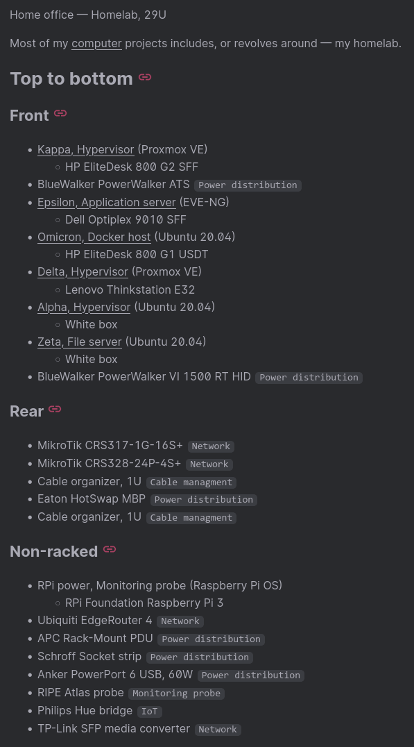 Most of my <a href="{{ ref $ "/computers" }}">computer</a> projects includes, or revolves around β my homelab.