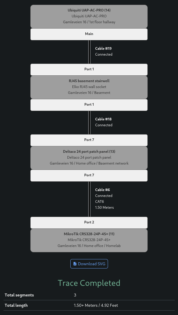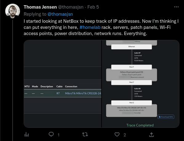 I did some tests, adding interfaces to devices, front and rear ports to patch panels, and connecting cables. It was really cool to be able to trace the network runs all the way from device to rack 👇