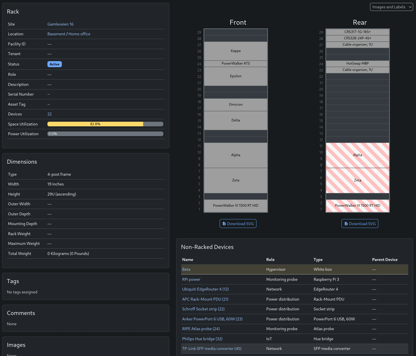 For the homelab rack; I got information on front, rear, and non-racked devices β as well as location, name, and height of the rack.