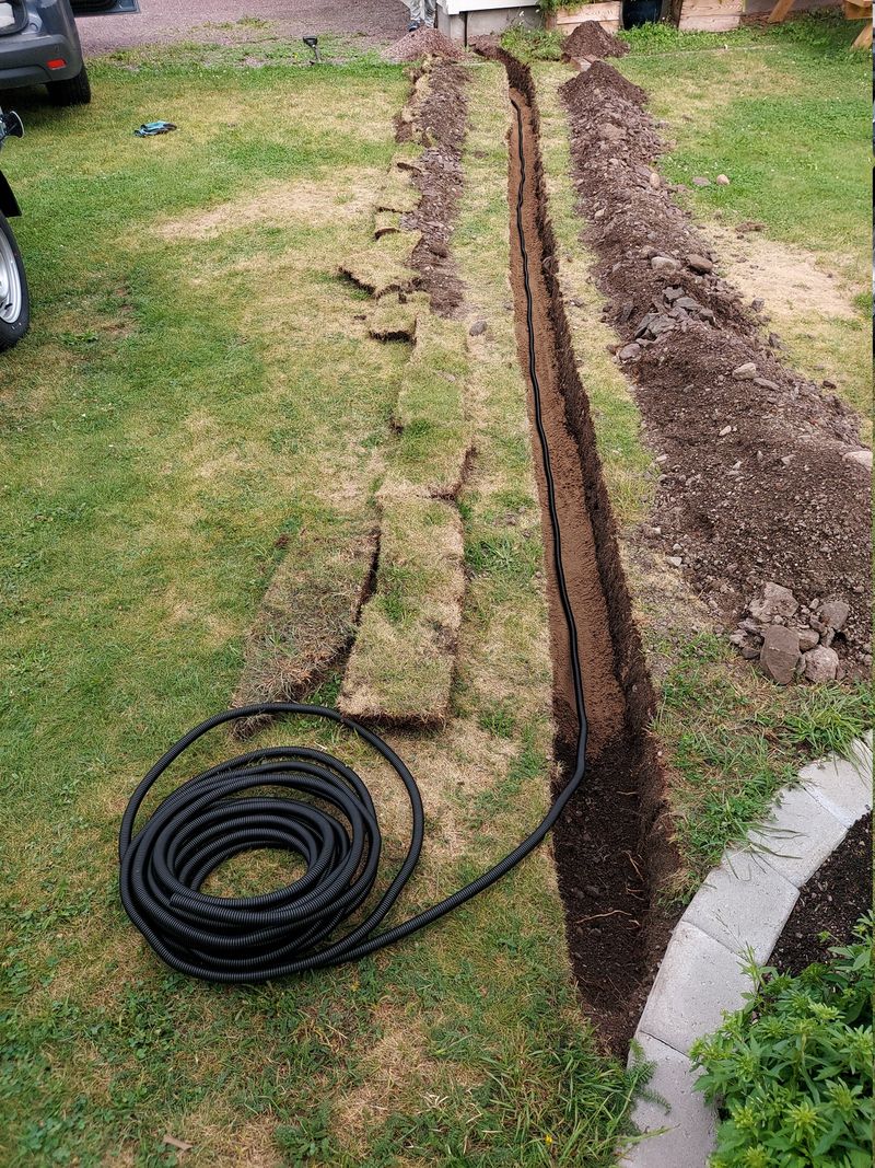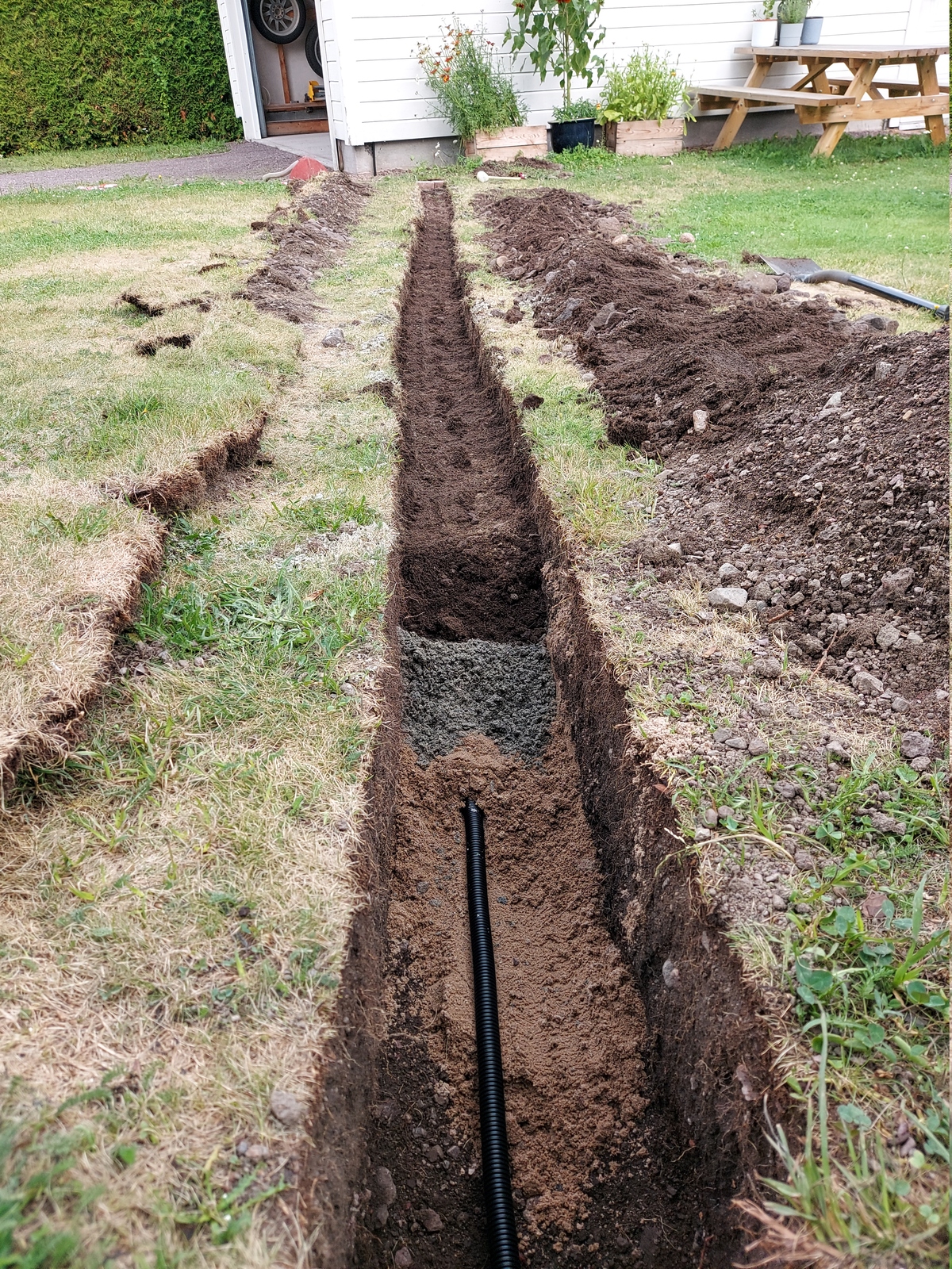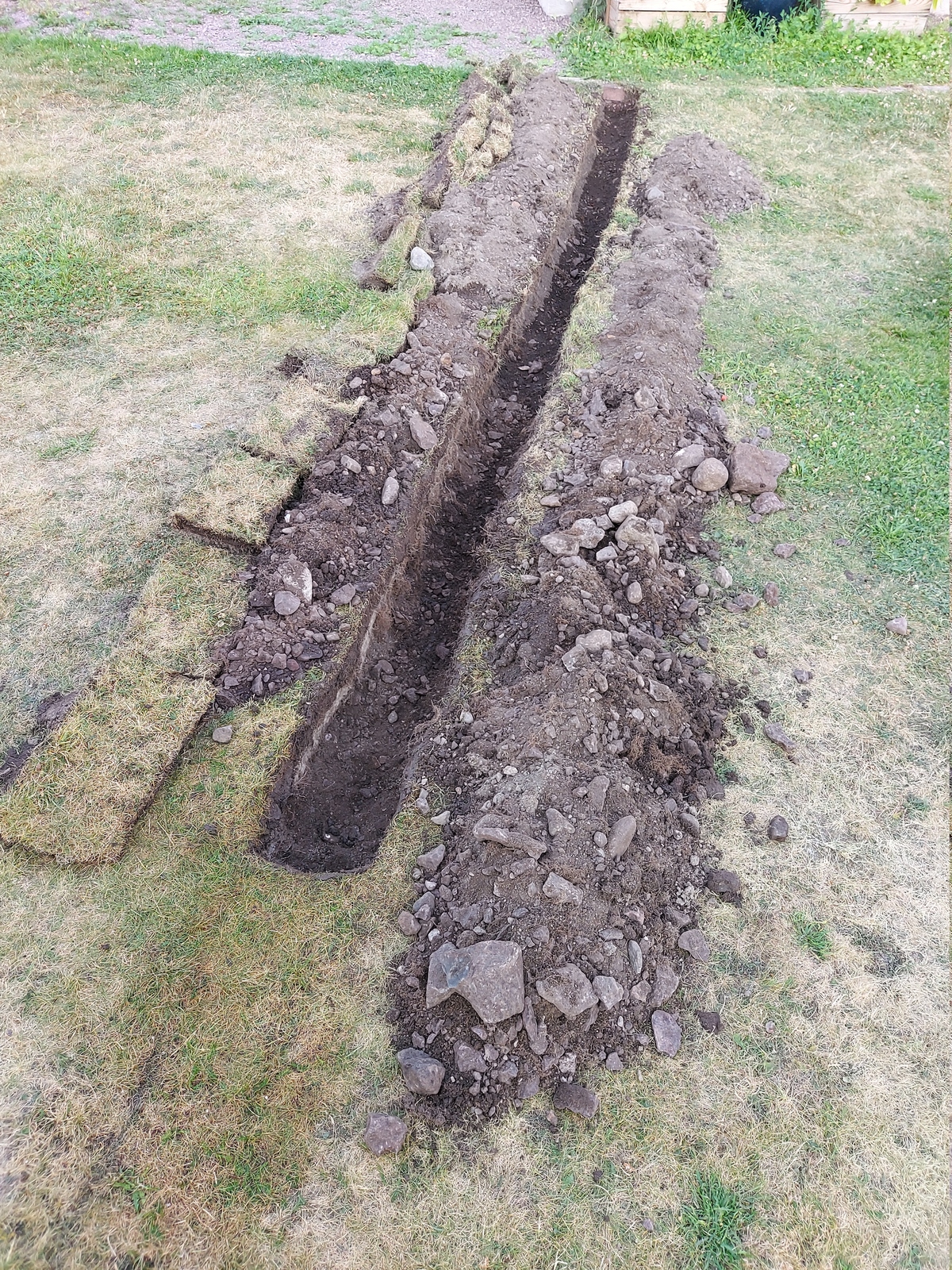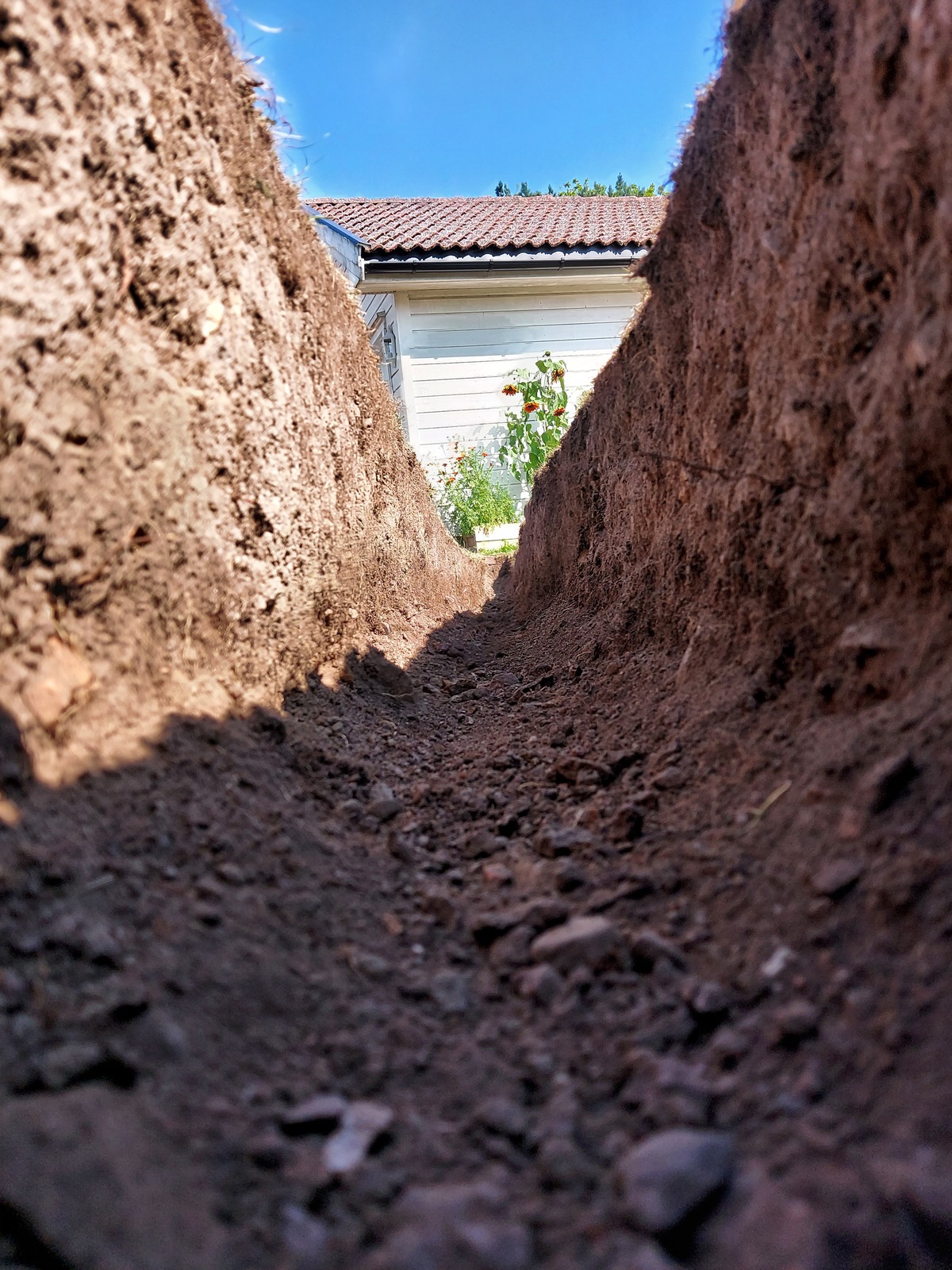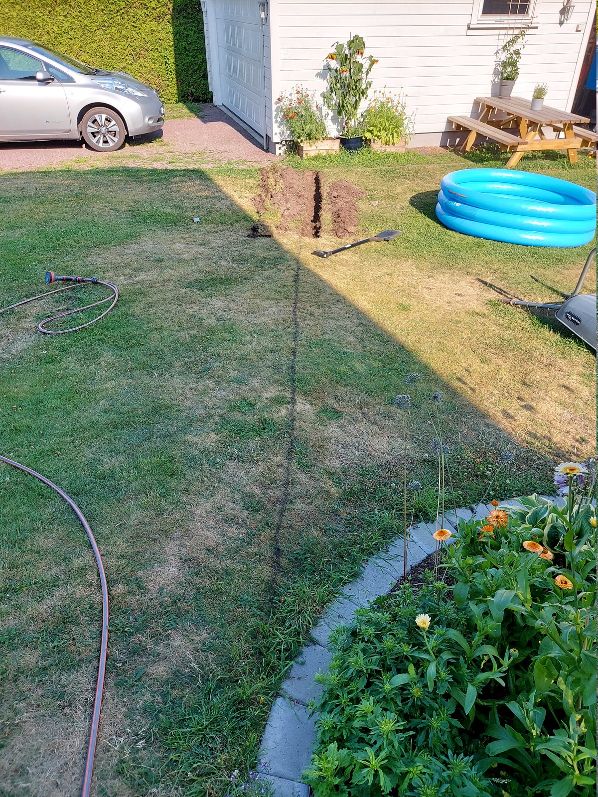 I still had to pull about 20-30 meters of CAT6 cable to get to a good location on the house, with a clear view of the garage. And my wife didn’t want any “ugly antennas” (her words), so I figured I’d just dig a trench across the 10 meters between the house and the garage.