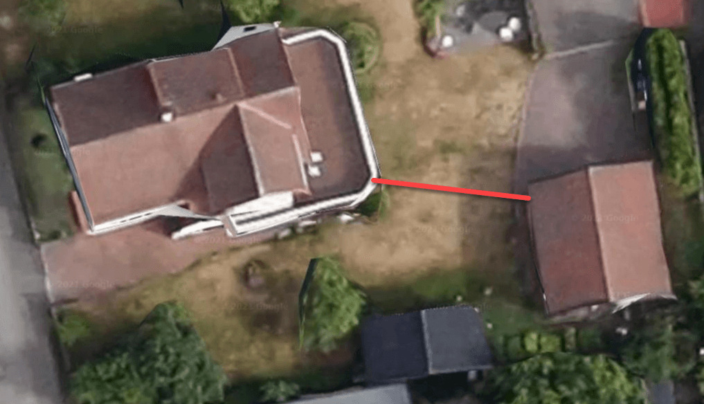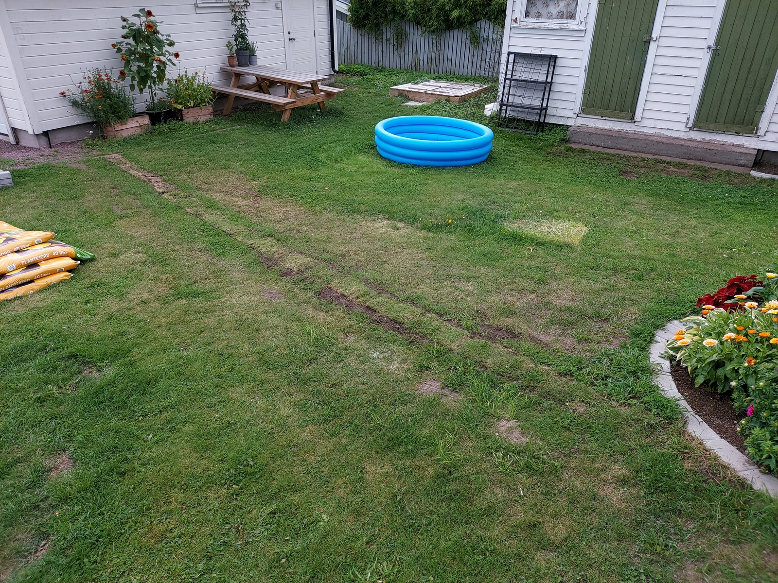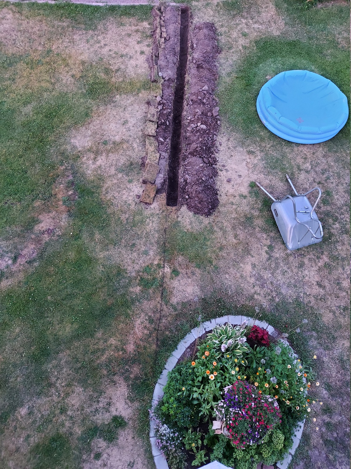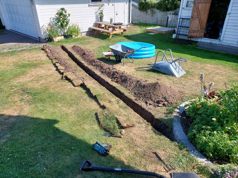 The new plan was to trench the shortest distance between the house and garage. From a support beam for the terrace, across the lawn, to the garage side wall — a distance of about 10 meters.