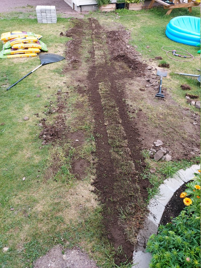 The pieces of grass I dug up earlier was put back, and I raked soil over it. Filling any holes, and removing rocks.