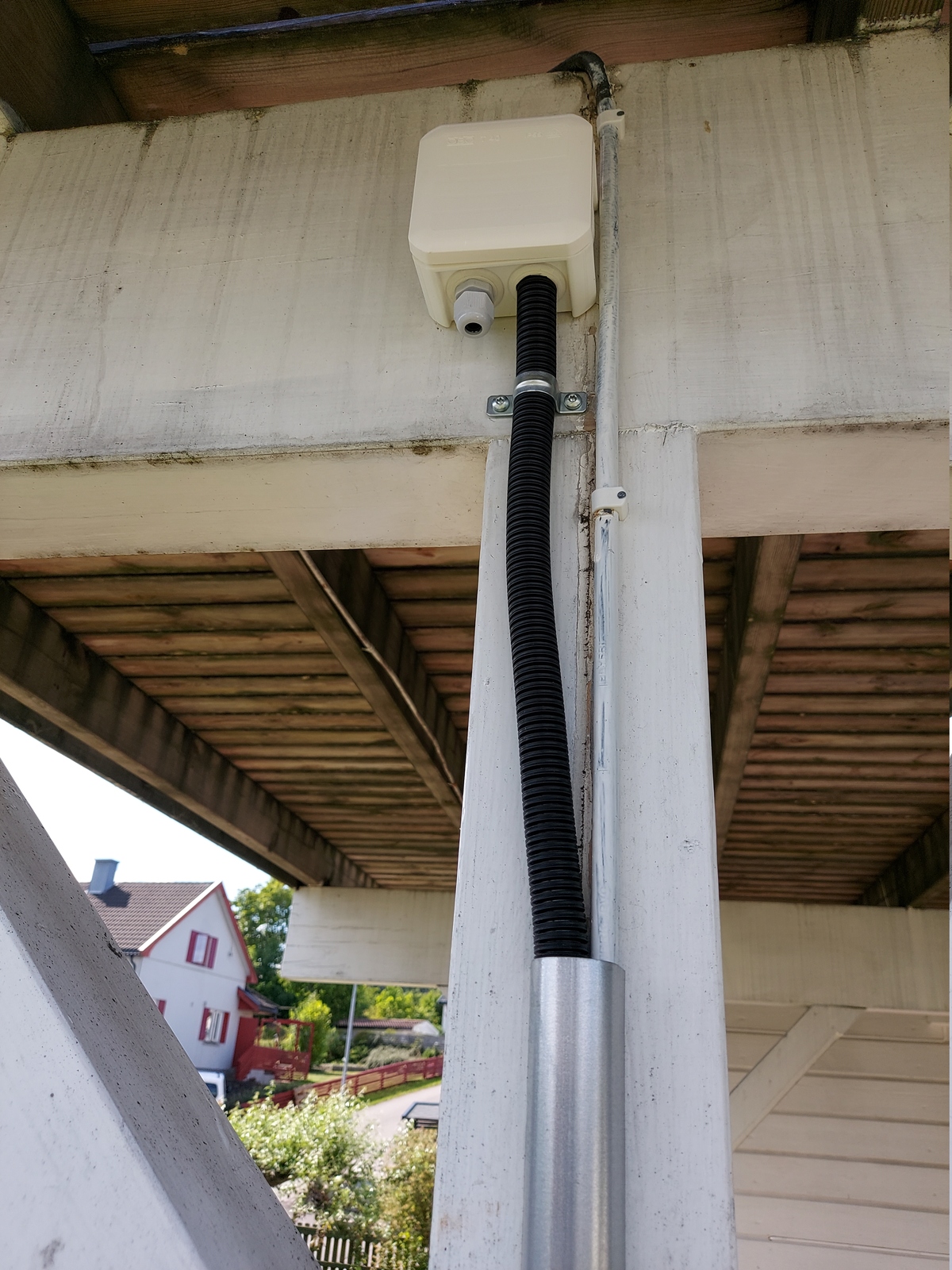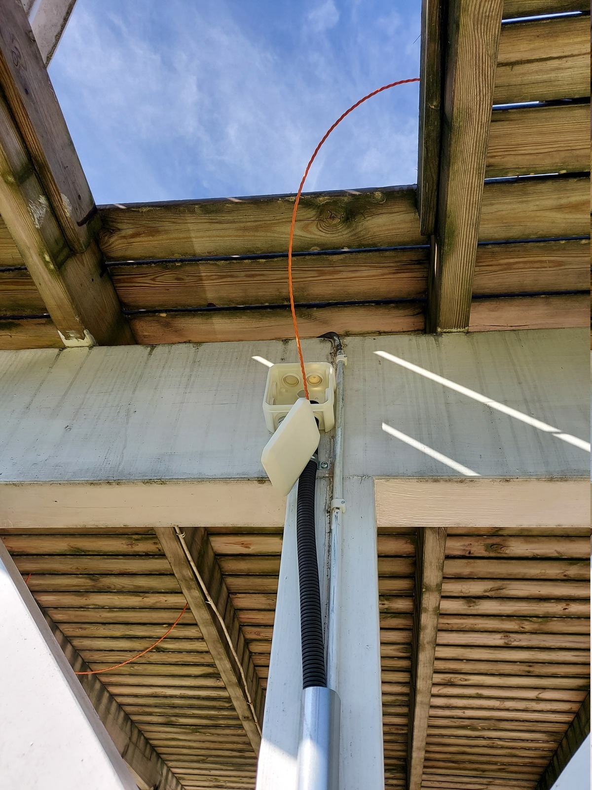 At the top of the beam; I put a IP55 rated junction box, to end the conduit and keep the water out. I installed a M16 cable gland, to get the CAT6 cable back out of the box.