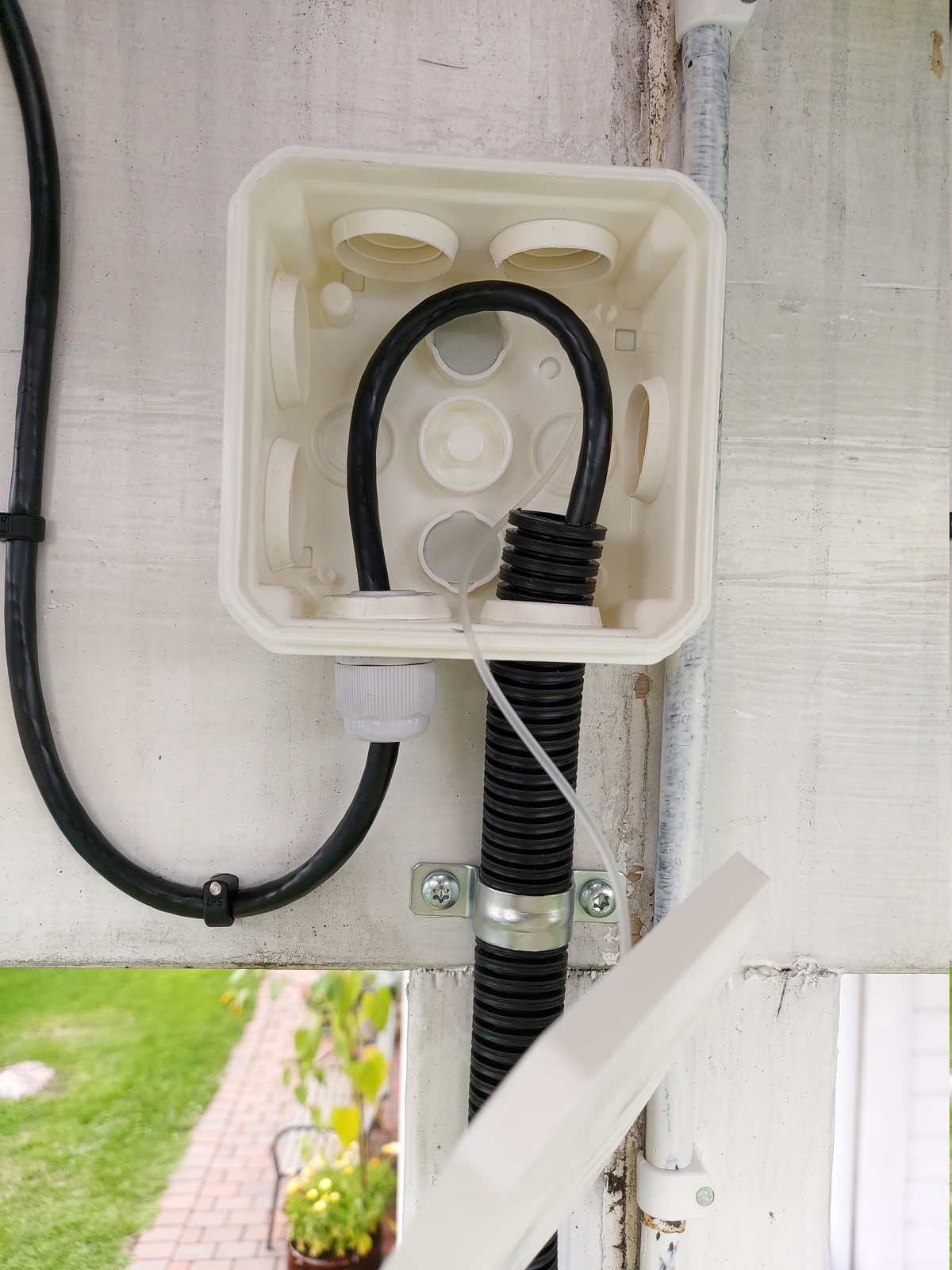 Then I started threading and fastening the cable. The junction box is just used to end the conduit, keeping the water out.