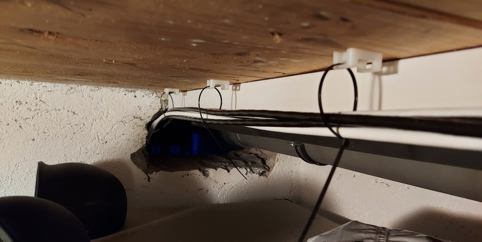 - Two CAT6 cables and a fiber — from the basement to the attic