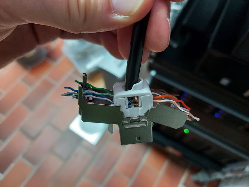 Then I cut the wires, closed the keystone jack, clicked it into the home office patch panel, and secured the cable.