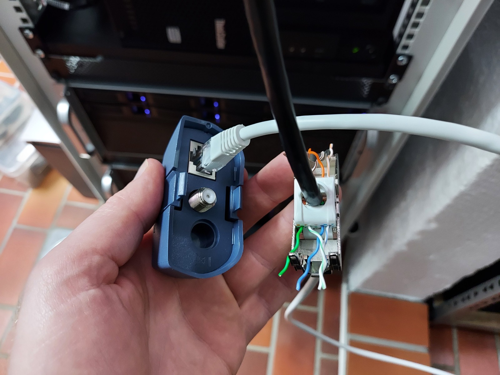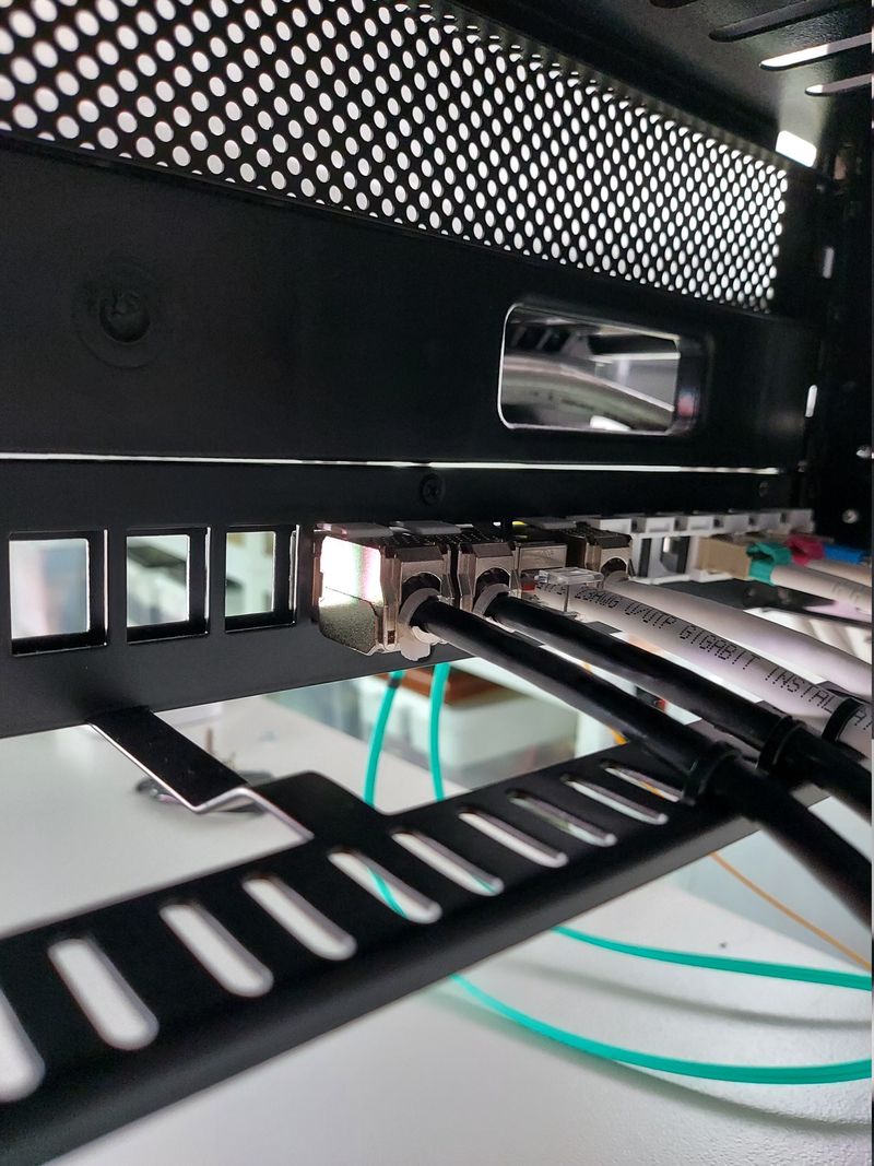 The cable now goes from the rack cabinet in the garage, all the way to the patch panel in my home office. With a total cable length of 40 meters — 15 of those in the conduit.