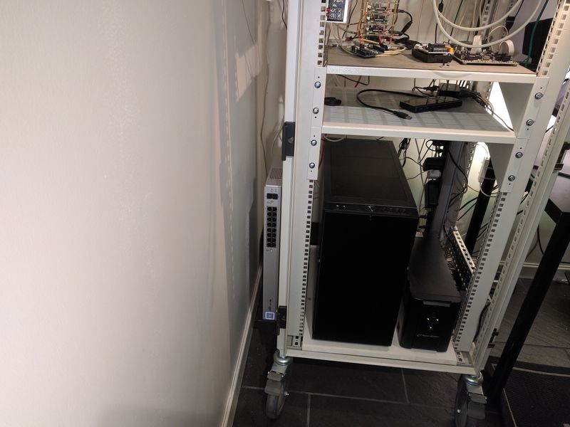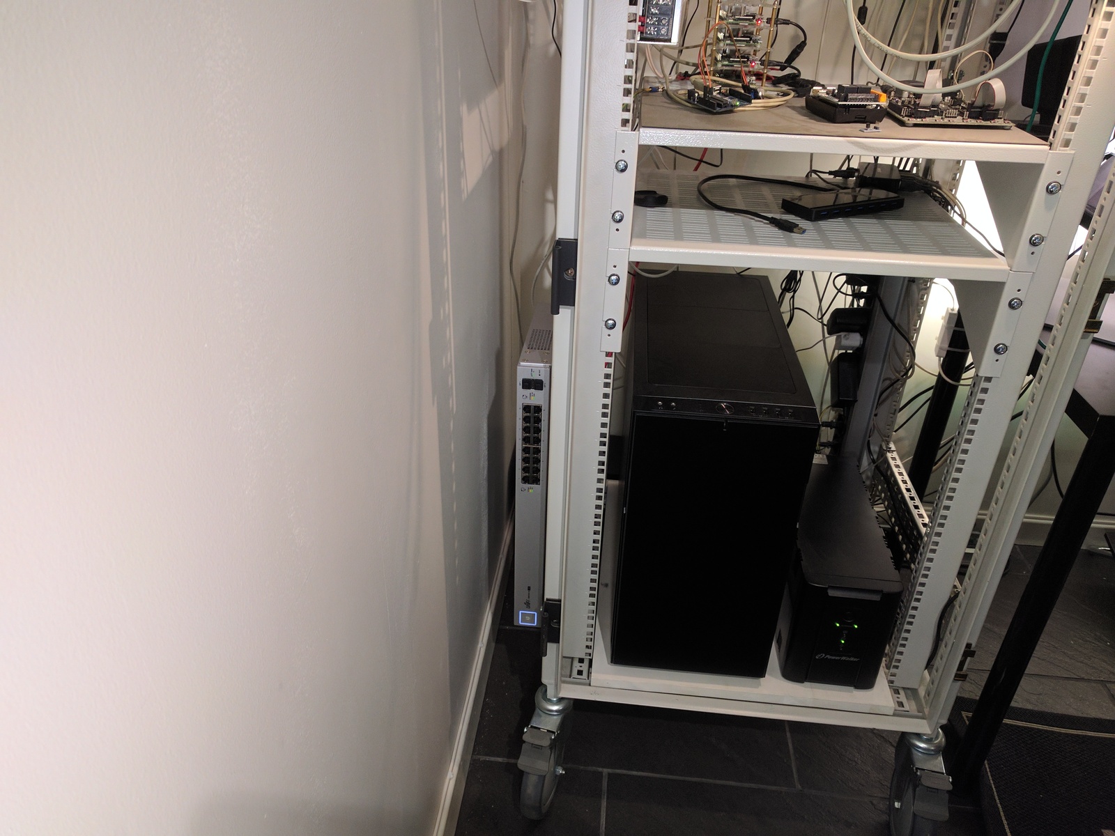 Behind the computer rack, there are three dual RJ45 sockets, these end up in the living room, in the basement living room and on the other end of the home office. On the other end of those, I have eight-ports switches. There is also an eight-port switch on the rack for all my Raspberry Pi devices.