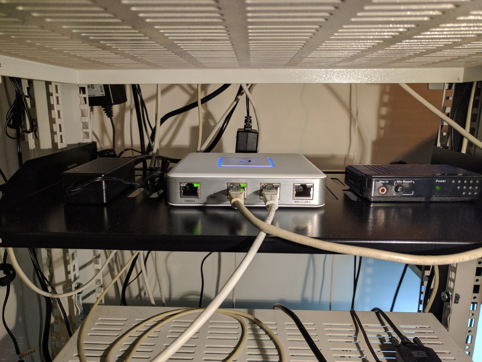 The USG is connected to the 16 port switch, which serves as my network backbone. So all other switches are downlinks from this switch. The backbone is mounted on the computer rack in the home office. I installed it on the lower left side of the rack instead of at the top because the temperature is lower by the floor, and this switch has a fan which turns on when the internal temperature reaches 70’C. And I’d like to avoid that; it is currently holding steady on 58’C.