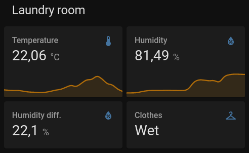 To achieve this I created two template sensors β one to calculate the difference in humidity between the 1st floor (by averaging values from two other sensors) and the laundry room. And the second to see if the difference is higher than 5%, if so β clothes are probably drying.