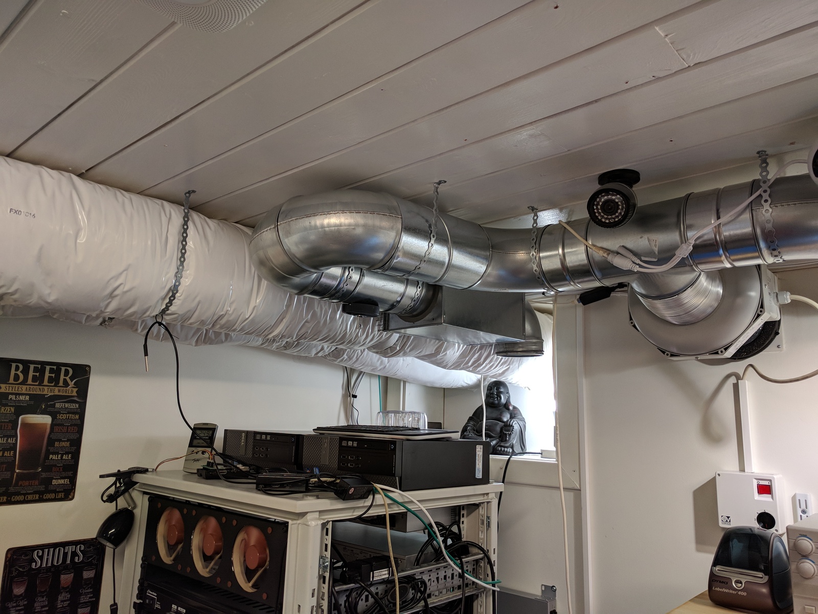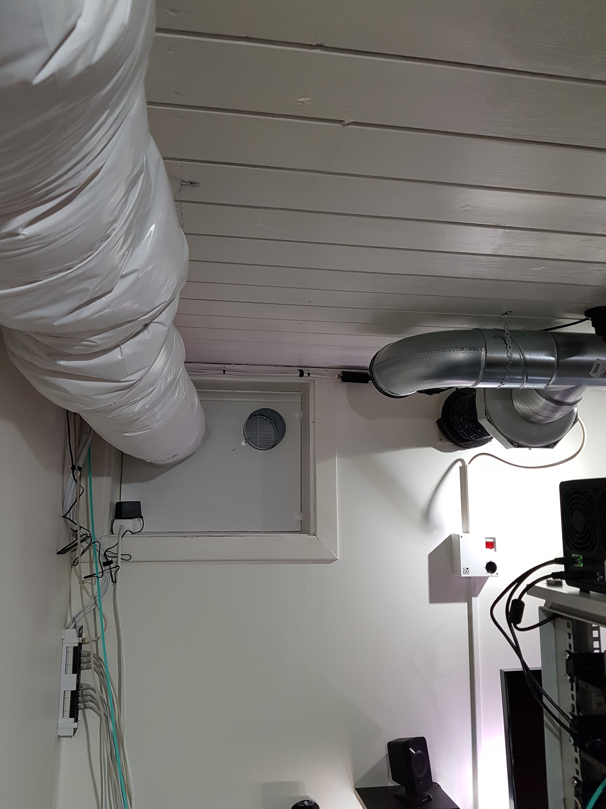 The intake was now close to the ceiling and above the rack. With the noise-trap, it was also considerably quieter than before. And it was more efficient, lowering the temperature in the room faster.