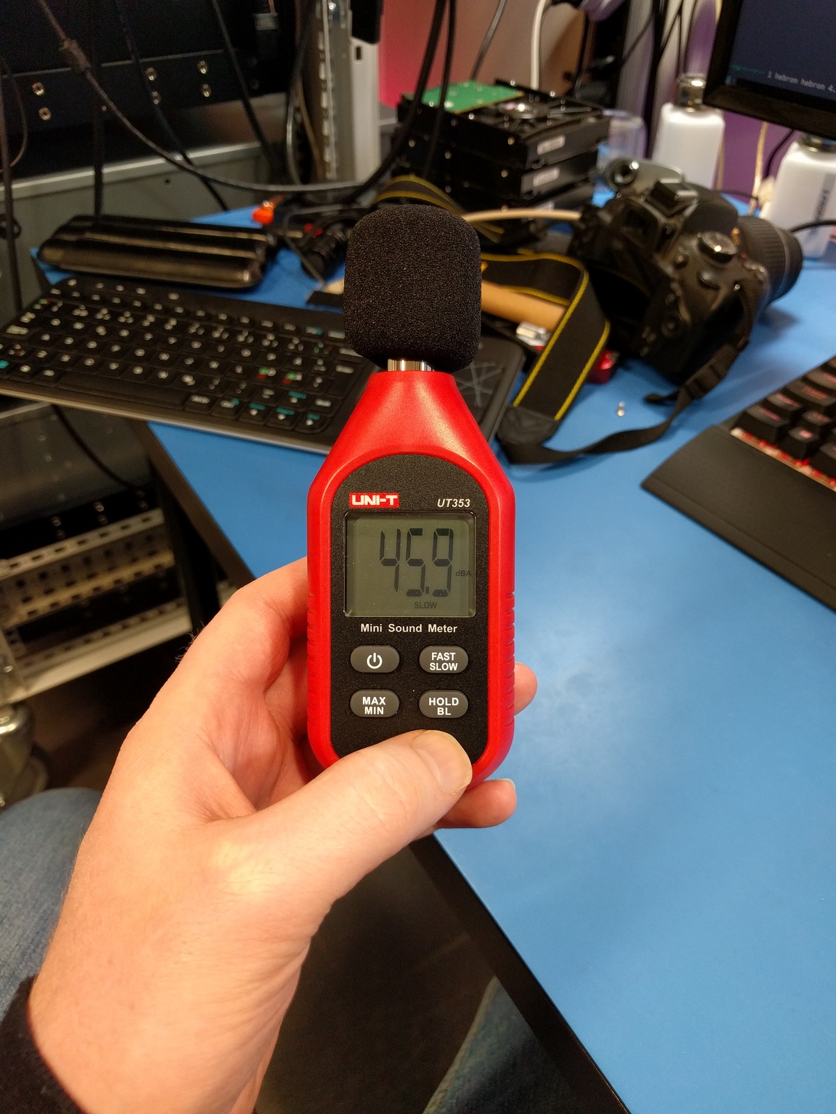 I figured it might be interesting with some noise levels — these are measured at my desk, where I sit, with a UNI-T UT353 sound level meter. All measurements were done with the fume extractor arm closed, and the valve for the ceiling intake fully open.