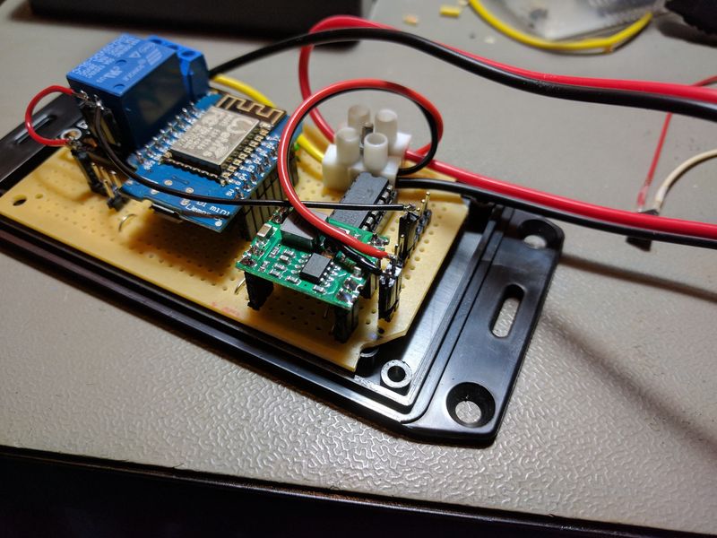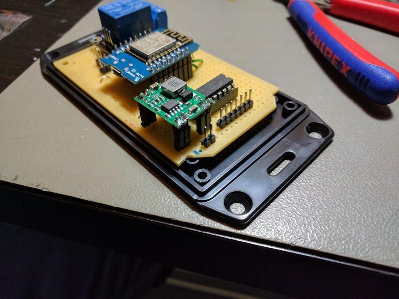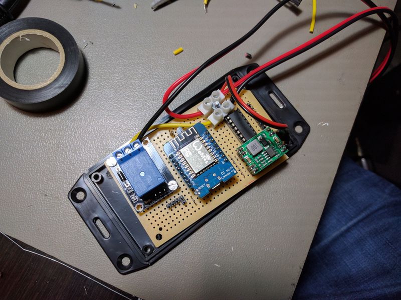 I’m using a buck step down converter to turn the input voltage into 5 V for the WeMos and relay. A step-down converter generates a lot less heat than a voltage regulator, that allows it to supply higher current with no cooling. The one I used here can handle 7 to 28 V input and delivers 3 A.