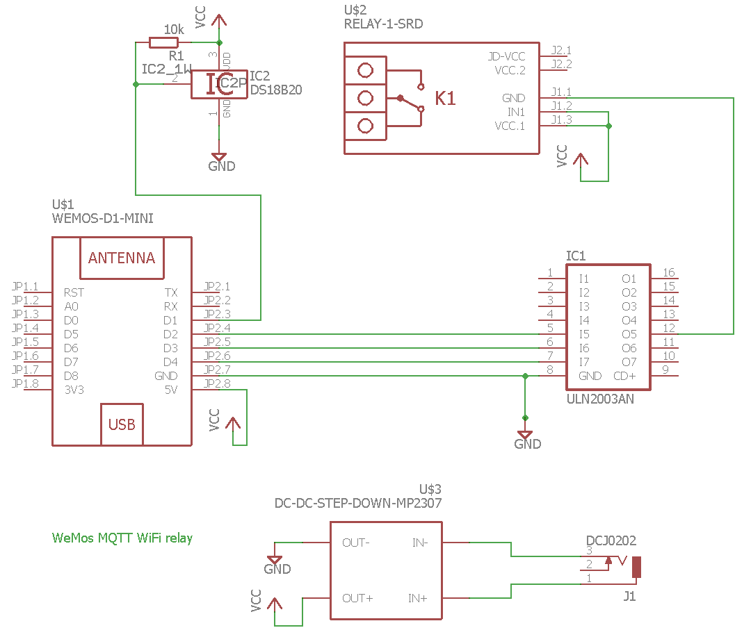 I’ve wanted to use an ESP8266 WiFi module in a project for some time now, and after reading about the WeMos board, I figured this was the easiest way to get started. The WeMos D1 mini is quite small and much easier to interact with and program than the ESP8266 devices. So I built this single relay controller, with internal temperature reporting. I am communicating with it using MQTT, which makes it really easy to implement it into things like Home Assistant.