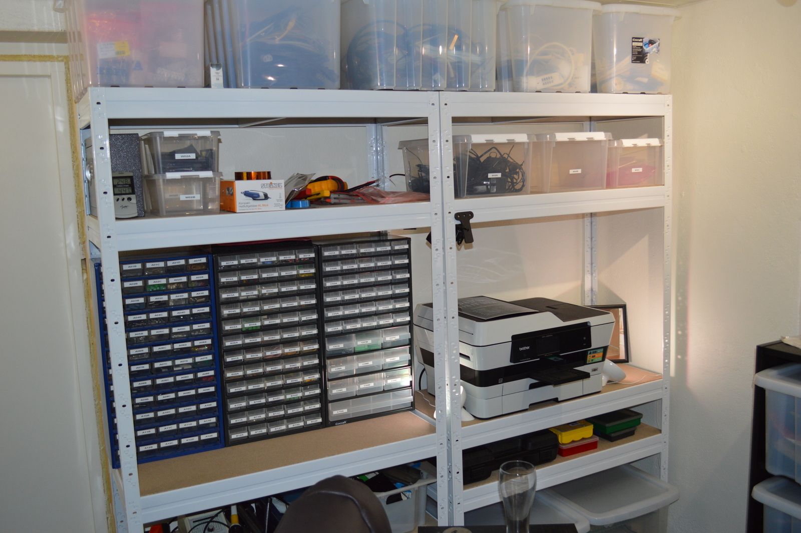 To find the parts I need, when I need them; I try to keep my part storage organized at all times. Small pieces in the drawer cabinets, and bigger parts in sealed ESD bags in the boxes. Each location has an ID number which is registered in my logistics system 🙂