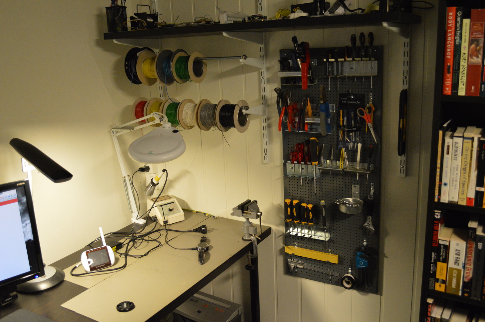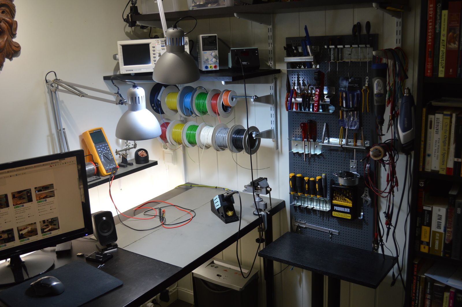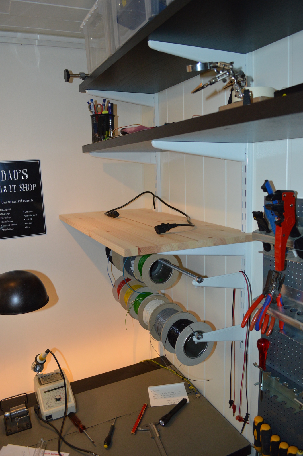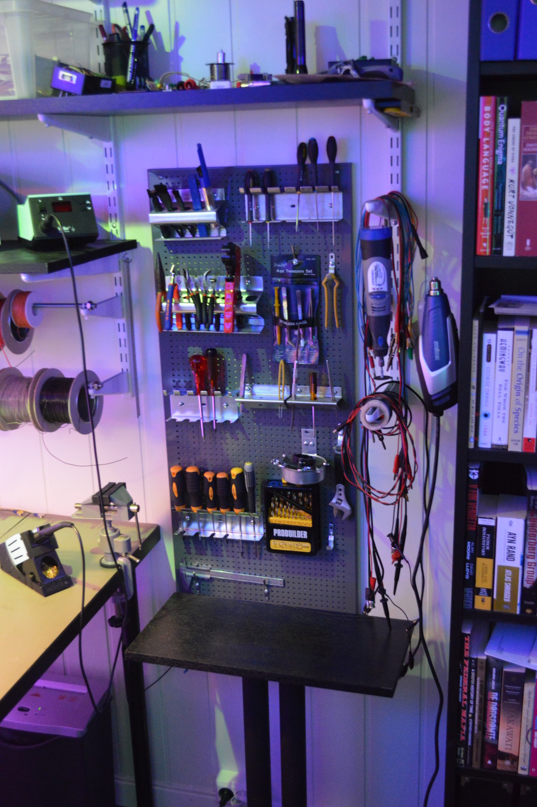 I had an old IKEA shelf and a speaker stand lying around, so I cut the shelf to size and made a tiny table. It adds a bit of work or storage surface, and every bit helps 🙂 The tool wall allows me to keep all of my most used tools and cables within arms reach. The hot air gun is plugged in and ready to go.