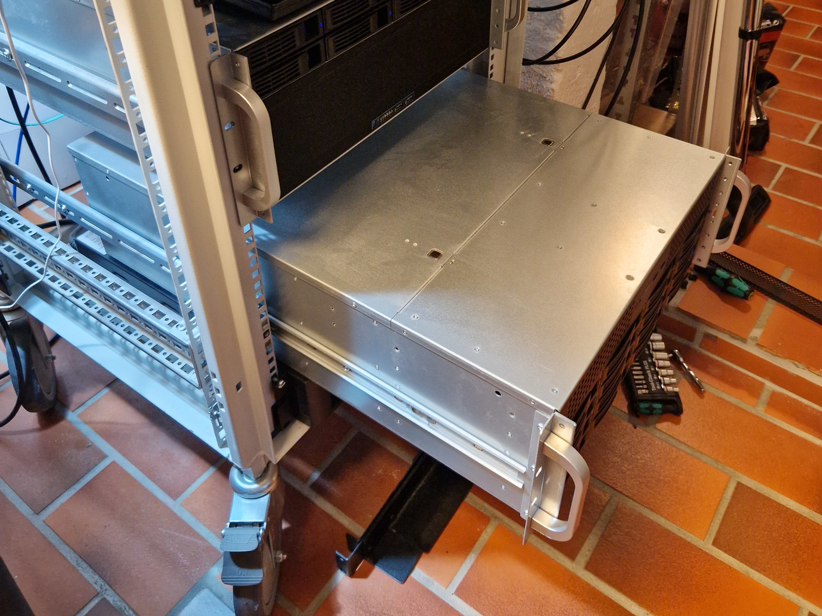 As part of my project to rearrange the rack, I mounted proper rack rails and removed the shelf that Zeta has been resting on for the last five years.