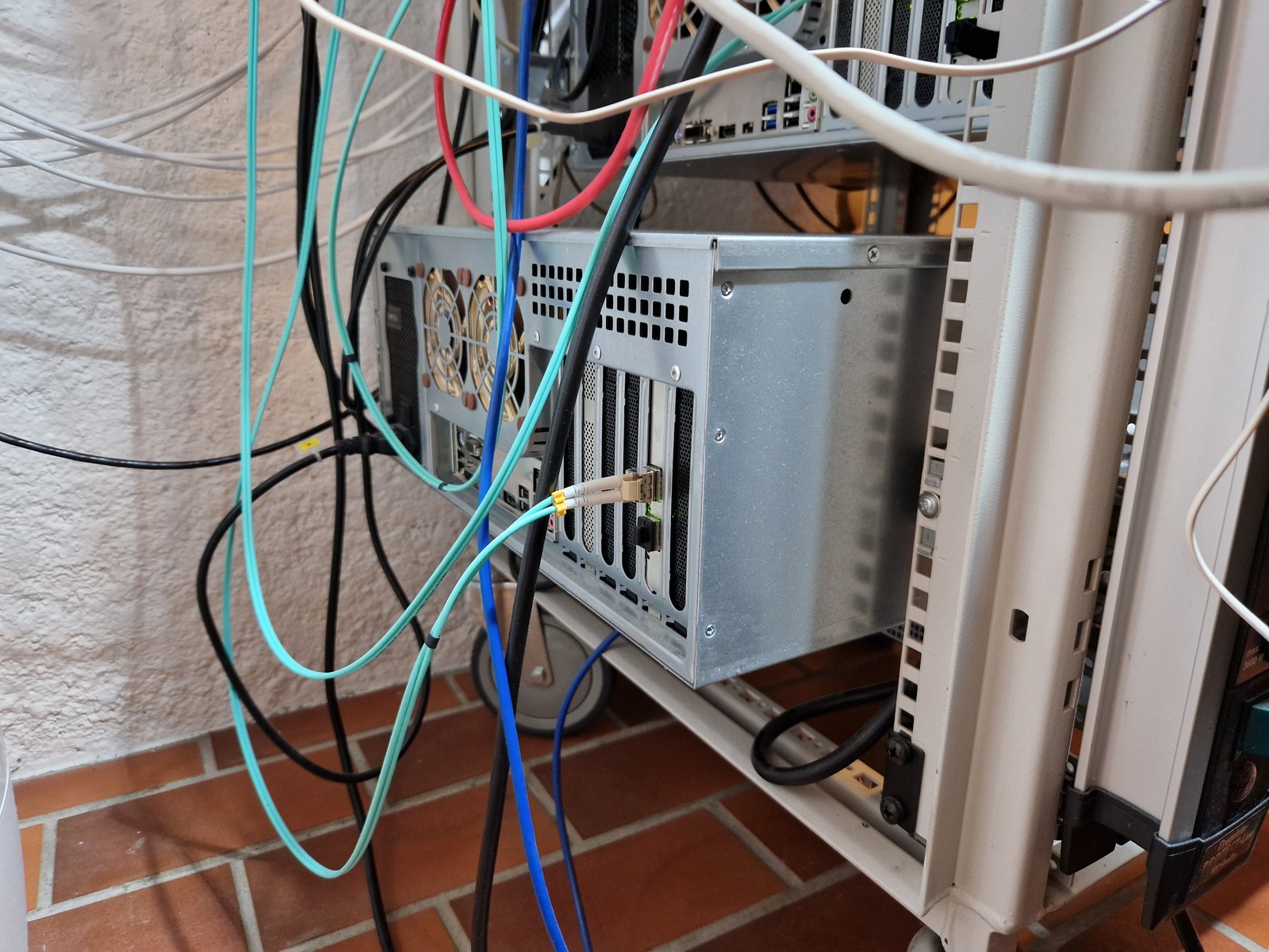 My server rack is 600x600 mm, and the server case is 688 mm deepβ¦ So the case sticks out about 9 cm behind the rack. Not really a problem β and the rails, with the variable depth, fit just fine 🙂