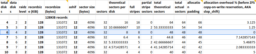 - 6 disks in raidz2 means 4 data disks, resulting in less allocation overhead according to this spreadsheet 👇